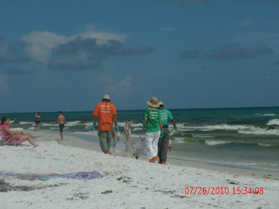 My sister's birthday is today, although the picture doesn't have anything to do with that. This is the firest time all summer we went to the beach. We read the warnings on the signs to watch for oil and tarballs, but really didn't see anything to worry about. These guys came walking down the beach kicking sand and seaweed around looking for tarballs and oilspots. They found some, but it really just drove home that the oil spill was really HERE. (if that makes any sense)